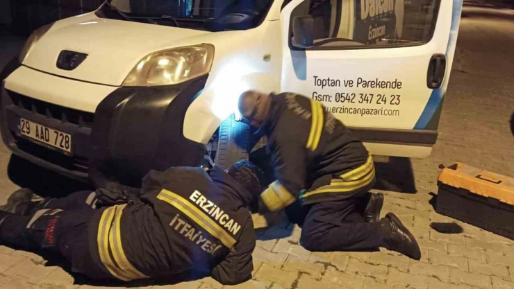 Erzincan'da aracın motor kısmında sıkışan kedinin imdadına itfaiye ekipleri yetişti.
