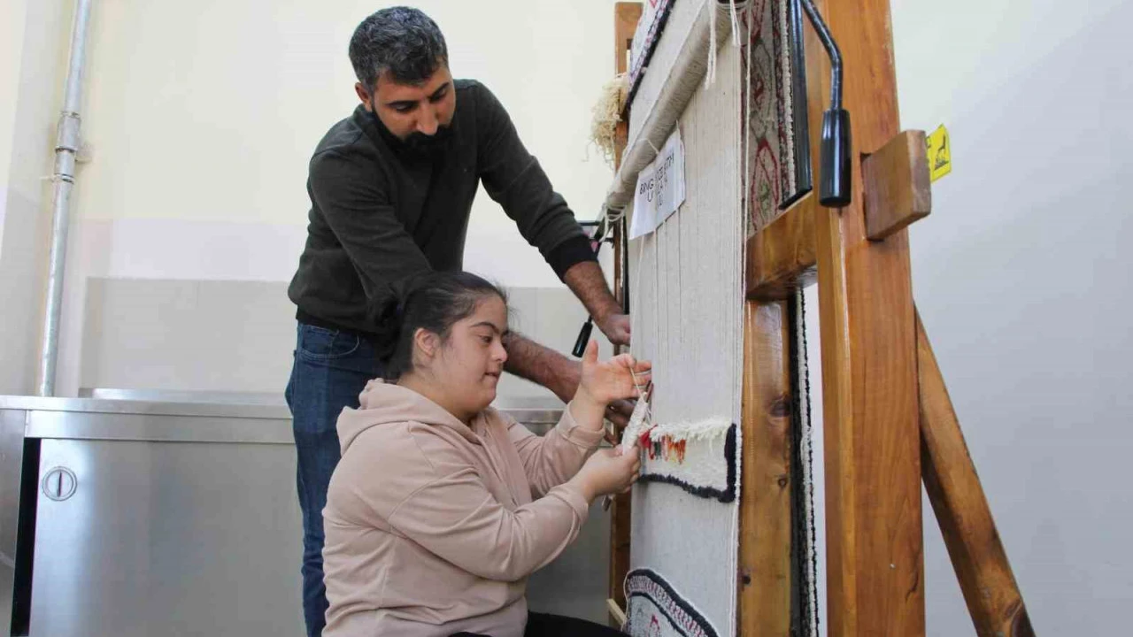 Bingöl’de Özel Eğitim Uygulama Okulu’nda açılan el sanatları atölyesinde özel öğrenciler, asırlık teknikle halı dokuyor.
