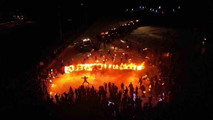 Dev Türk bayrağı ile zirveden kayan kayakçıların ardından meşaleli kayak gösterisi yapıldı. Kar motorlarının gösterisi katılımcılardan tam not aldı.