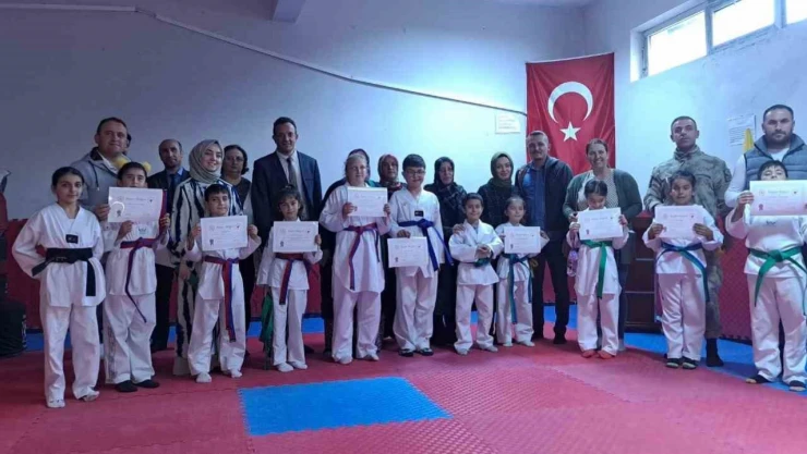 Ardahan'ın Posof ilçesinde minik taekwondocuların kuşak heyecanına aileleri de ortak oldu.