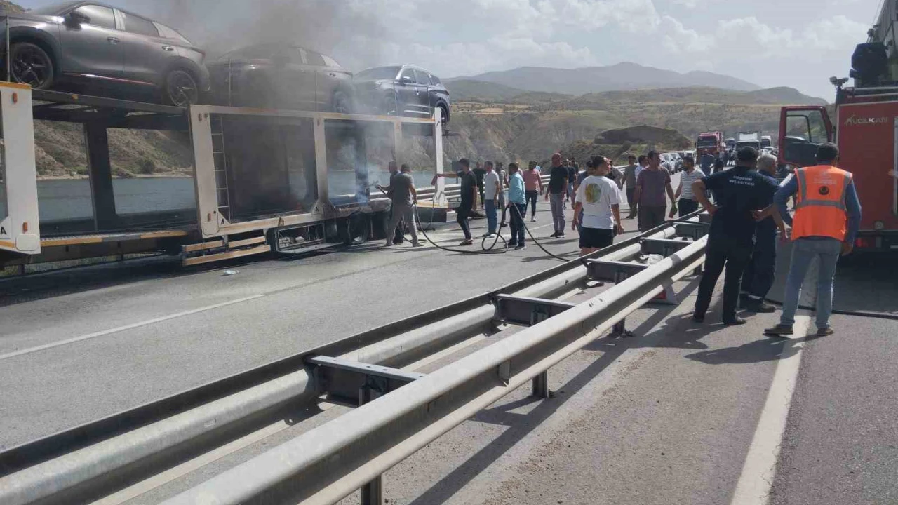 Sivas'ın Suşehri ilçesinde araba taşıma römorkunun tekerlediğinde çıkan yangın taşıdığı sıfır kilometre araçlara sıçramadan söndürüldü.