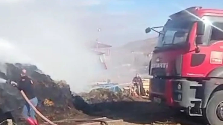 Iğdır'ın Tuzluca ilçesinde bir evin soba bacasından çıkan kıvılcımlar yakındaki 2500 ot balyasını küle çevirdi.