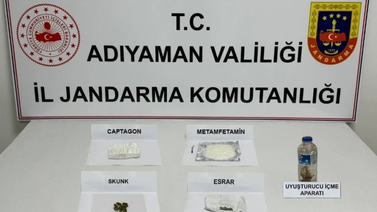 Adıyaman İl Jandarma Komutanlığınca il merkez ve ilçelerinde belirlenen uyuşturucu satıcı ve kullanıcılarına yönelik çalışma yaptı. Yapılan çalışmalar neticesinde 5 adet captagon, 6 gram toz esrar, 95 gram skunk, 10 gram metamfetamin ve 4 adet uyuşturucu kullanma aparatı ele geçirildi. Uyuşturucu maddeler muhafaza altına alınırken 12 şahıs gözaltına alınarak jandarma komutanlığına götürüldü.