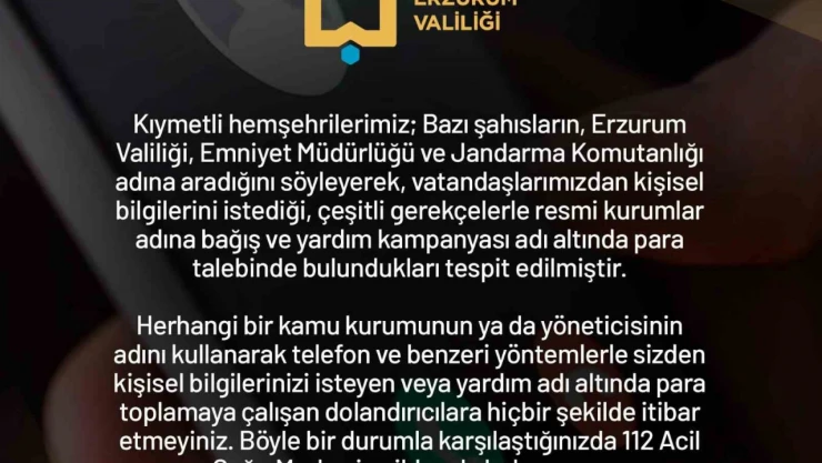 Erzurum Valiliği tarafından yapılan açıklamada şöyle denildi: “Kıymetli hemşerilerimiz, bazı şahısların Erzurum Valiliği, Emniyet Müdürlüğü ve Jandarma Komutanlığı adına aradığını söyleyerek vatandaşlarımızdan kişisel bilgilerini istediği, çeşitli gerekçelerle resmi kurumlar adına bağış ve yardım kampanyası adı altında para talebinde bulundukları tespit edilmiştir. Herhangi bir kamu kurumunun ya da yöneticisinin adını kullanarak telefon ve benzeri yöntemlerle sizden kişisel bilgilerinizi isteyen veya yardım adı altında para toplamaya çalışan dolandırıcılara hiçbir şekilde itibar etmeyiniz. Böyle bir durumla karşılaştığınızda 112 Acil Çağrı Merkezine ihbarda bulununuz.”