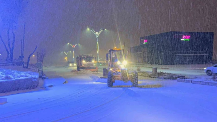 Van'da dün akşam saatlerinde etkili olan yoğun kar yağışı ile birlikte çalışmalarına başlayan Van Büyükşehir Belediyesi karla mücadele ekipleri, gece boyu çalışmalarını sürdürdü.