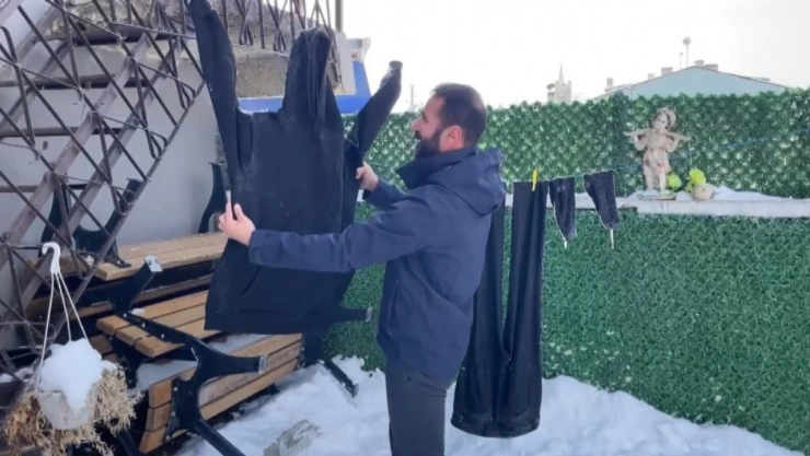 Erzurum’un Aşkale ilçesinde sinema oyuncusu ve fenomen Arif Arifoğulları, evinin bahçesinde ipe astığı kıyafetleri unutunca almak için döndüğünde giysilerini donmuş halde buldu. Bu anları videoya kaydeden Arif Arifoğulları, yüzlerde tebessüm oluşturdu.