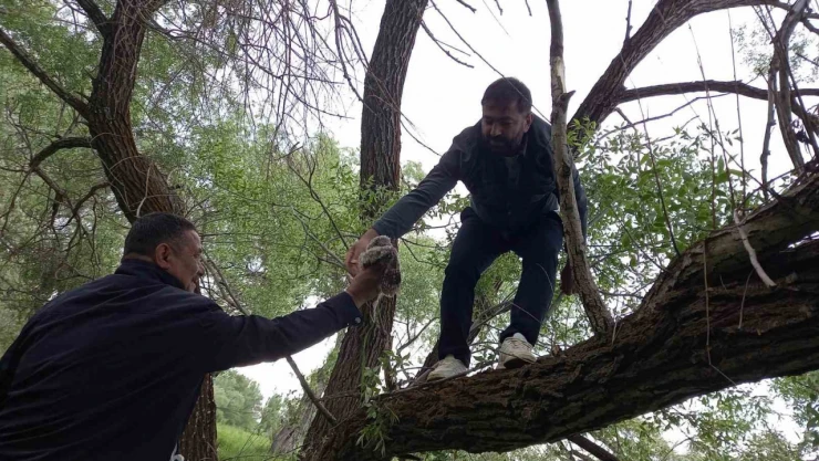 Bitlis'in Güroymak ilçesinde doğa yürüyüşüne çıkan grup arkadaş, ağaçtaki yuvasından düşen baykuş için adeta seferber oldu.