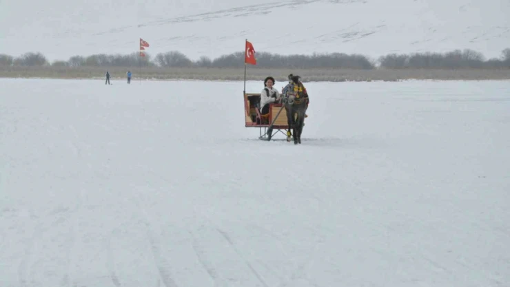 Kars’a gelen vatandaşların yüzeyi tamamen buzla kaplı Çıldır Gölü’nde atlı kızak heyecanı devam ediyor.