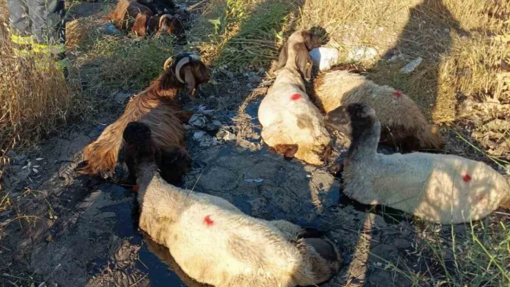 Adıyaman'da tarlaya dökülen asfalt ziftine batan 8 küçükbaş hayvan itfaiye ekiplerinin uzun uğraşları sonucunda kurtarıldı.